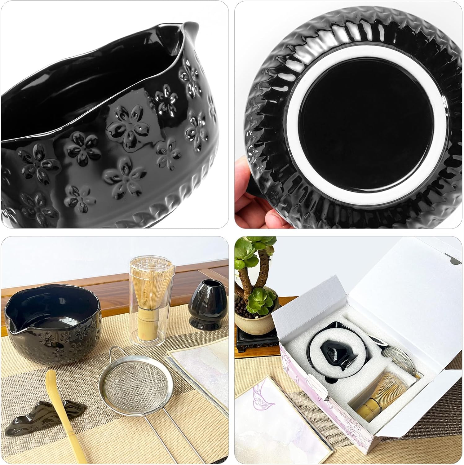 Matcha Whisk Set - Traditional Japanese Handmade Bamboo Matcha Whisk and Holder, Matcha Bowl,Bamboo Scoop, Scoop Rest, Sifter and Tea Towel (Black)