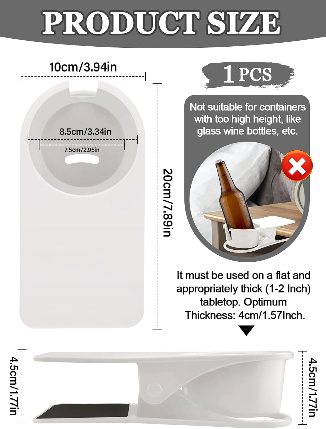 - Keep Your Desktop Tidy: This cup holder clamp has an opening of 3.3 inches and can bear 1 kg. It can be clamped on tables with 1"~2.5" thickness, and is more suitable for thicker surfaces above 4cm/1.57". It is ideal for placing drinks, mobile phones, plants, etc. In addition, it can also be used in classrooms, game rooms, hospitals, and on buses and trains. It is your right-hand helper to keep your desktop tidy!