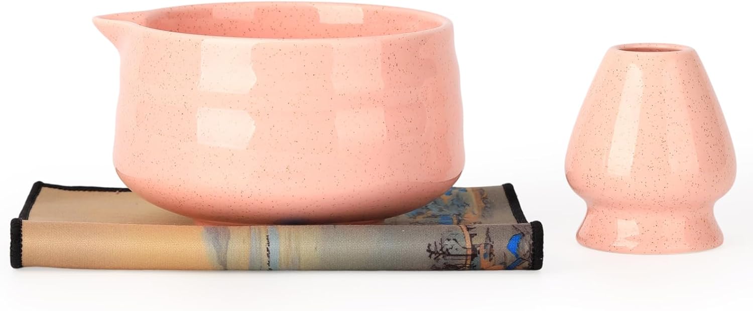 Japanese Ceramic Matcha Bowl - 16oz Speckle Glaze Chawan & Whisk Stand for Perfect Froth, Dishwasher Safe Pink