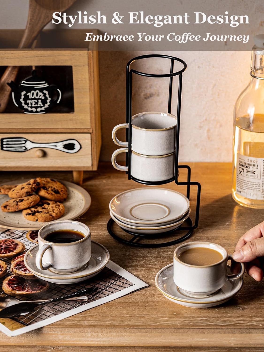 Gomakren 2.5 Ounce Espresso Cups Set of 4, Small Stackable Coffee Cups with Saucers and Metal Stand, Porcelain Demitasse Cups for Specialty Coffee Drinks, Espresso, Cappuccino, Latte, Tea, White