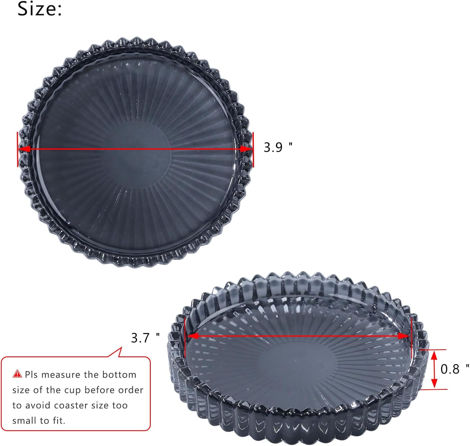 - Perfect Size- Set of 6 crystal drink coasters. The outer diameter of this coaster is 3.9 inches; the inner diameter of this coaster is 3.7 inches; the height of this coaster is 0.8 inches; suitable for most of cups and mugs, making them the perfect size for holding coffee cups, sports bottles, craft cocktails and tumblers. ( But pls measure the bottom size of the cup before order to avoid coaster size too small to fit.)