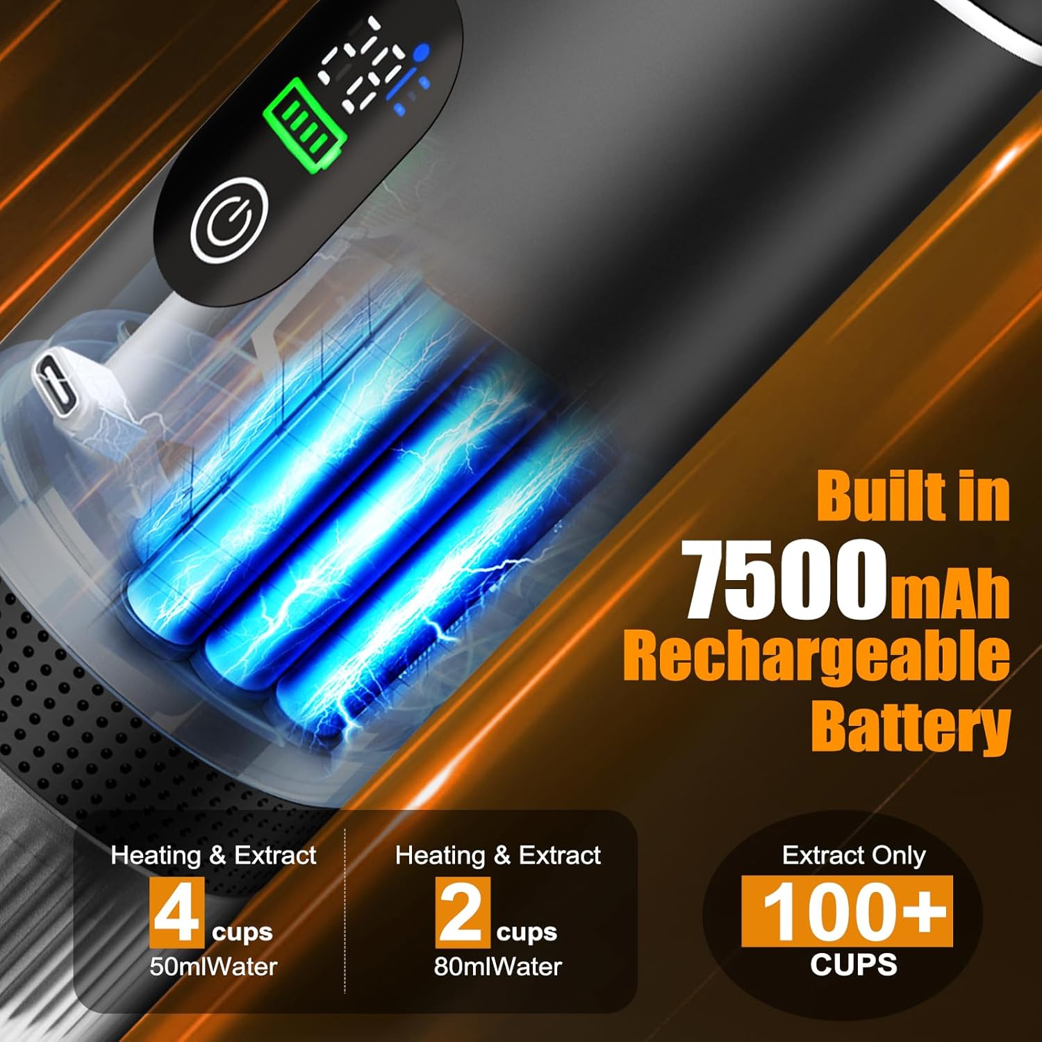 - Long-Lasting 7500mAh Battery: Battery powered coffee maker adapts high-capacity battery supports multiple brews on a single charge, travel coffee maker supports up to 4 espresso shots with cold water or 100+ brews with hot water on a single charge.USB-C fast charging for quick power-ups. Energy-efficient to maximize usage. Perfect for trips or power outages.