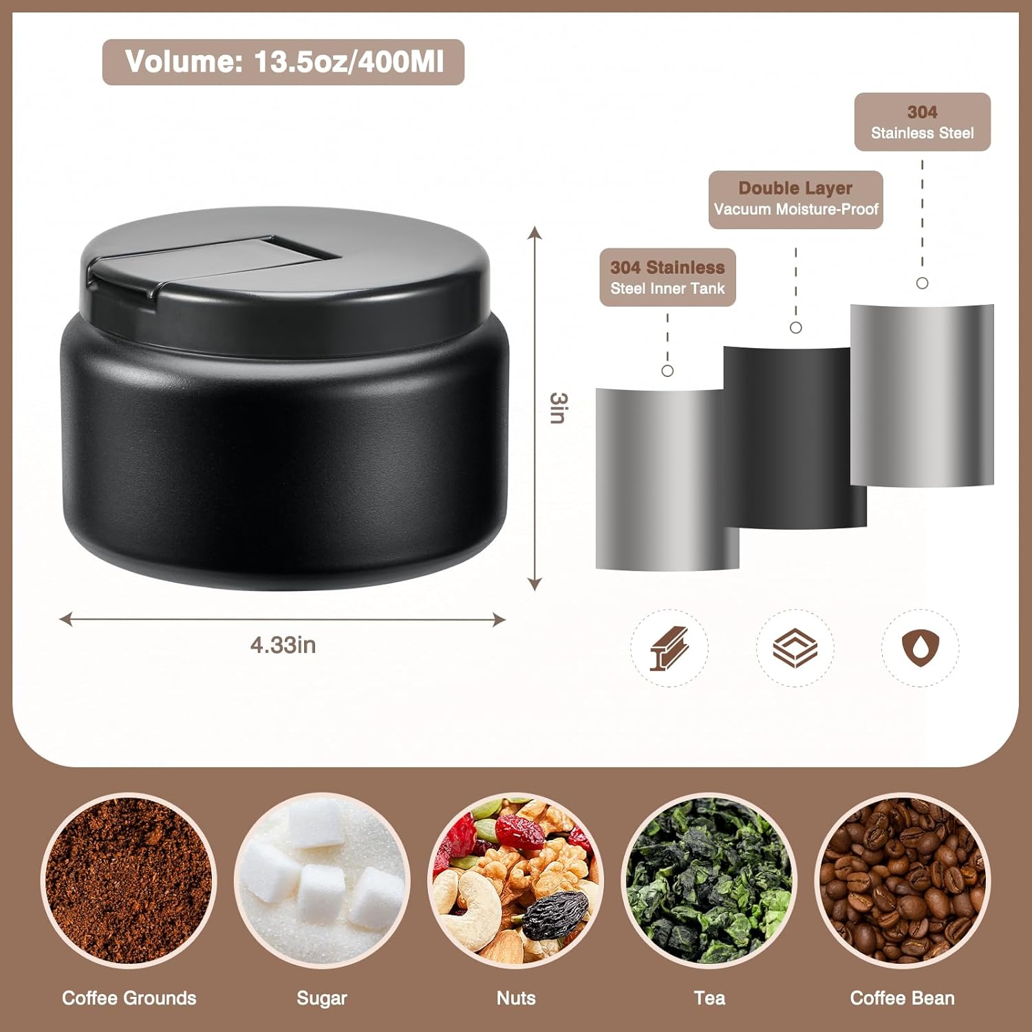 Coffee Canister, Premium Stainless Insulated Vacuum Steel Coffee Bean Storage Container Travel Jar, Kitchen Food Airtight Coffee Grounds Container for Tea, Sugar, Flour (13.5oz-Black)