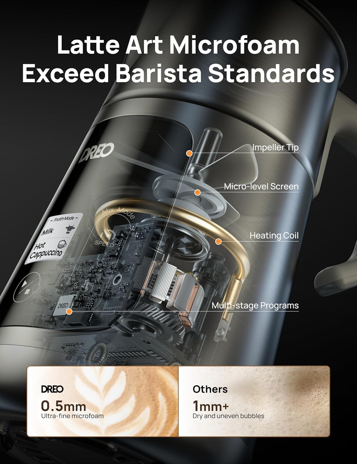 - π½ππ§ππ¨π©π-πππ«ππ‘ ππ€ππ’: DREO's multi-stage frothing technology replicates the steps taken by professional baristas, which balances temperature and air blending without diluting the milk, resulting in a rich velvety and creamy taste.