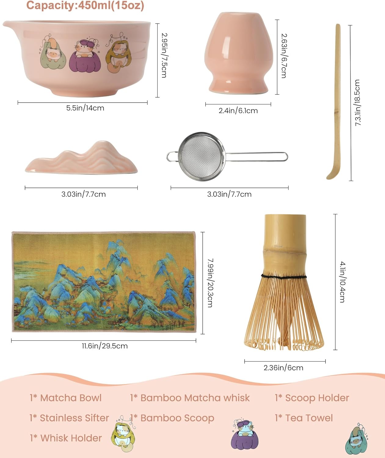 Matcha Whisk Set, 7 Pcs Pink Matcha Set Includes Matcha Bowl,Matcha Whisk and Holder, Bamboo Scoop, Scoop Rest, Sifter and Tea Towel -Matcha Kit for Matcha Lovers