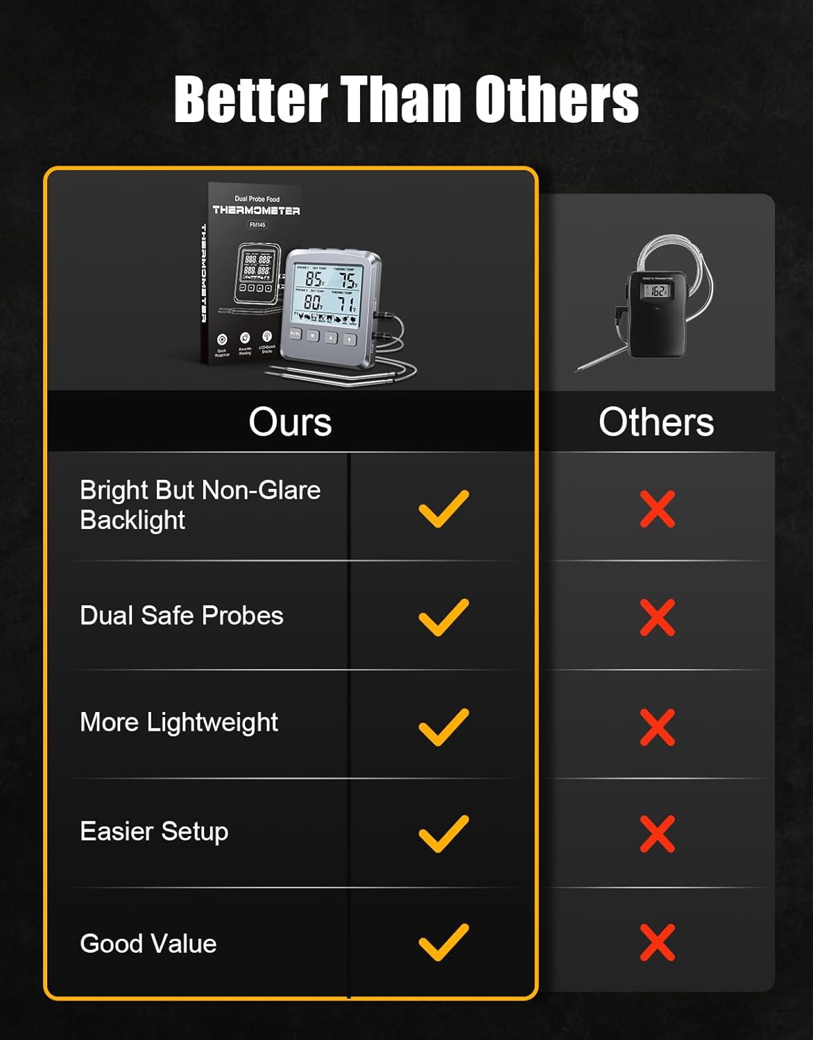 - 【Dual Precision Probe Monitoring】Vuwwey meat thermometer comes with two 40-inch high-precision, instant read probes with an accuracy of ±2℉ between 14℉ and 572℉ while enabling simultaneous monitoring of different meats or ensuring perfectly even cooking temperatures throughout your food