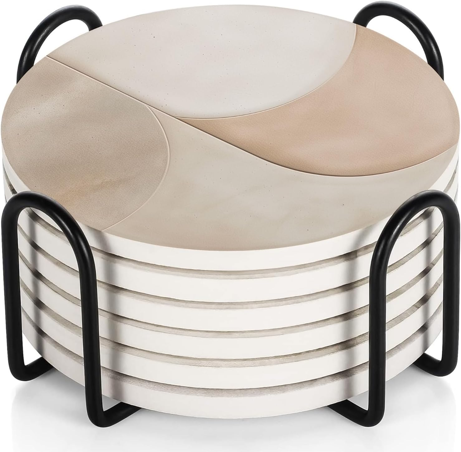 - ABSORBENT CERAMIC STONE: VEYRO coasters for drinks are crafted from premium ceramic that is naturally absorbent, gently drawing in water rings and condensation before they touch your surfaces. Designed with balance and precision, they keep your coffee tables and desks spotless — so every sip feels calm, effortless, and beautifully in place. Perfectly sized for mugs, tumblers, wine glasses, and even vases or small planters.