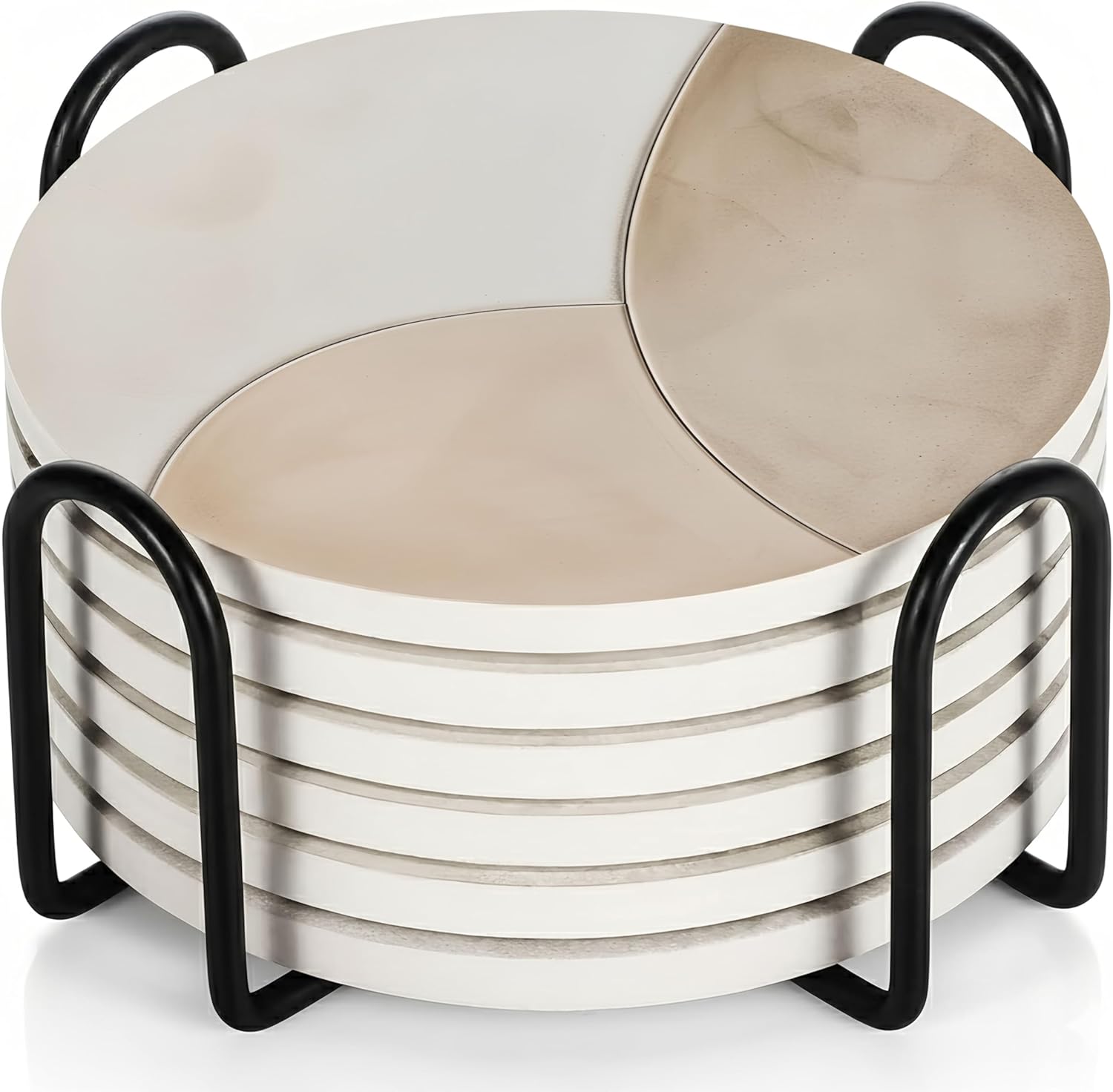 - ABSORBENT CERAMIC STONE: VEYRO coasters for drinks are crafted from premium ceramic that is naturally absorbent, gently drawing in water rings and condensation before they touch your surfaces. Designed with balance and precision, they keep your coffee tables and desks spotless — so every sip feels calm, effortless, and beautifully in place. Perfectly sized for mugs, tumblers, wine glasses, and even vases or small planters.