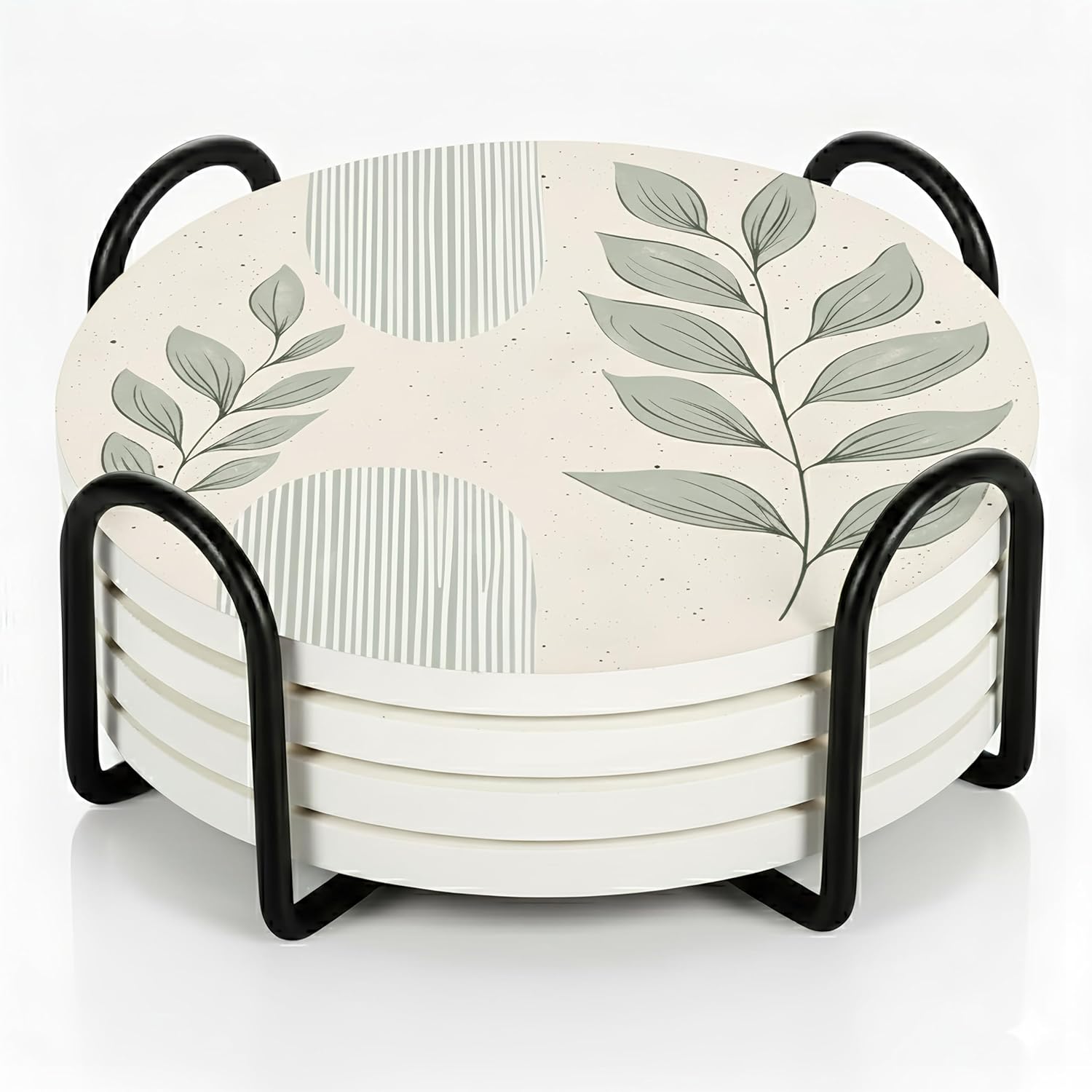 - INSIDE EVERY VEYRO SET: Each set includes 4 ceramic coasters (4" diameter, 0.28" thick) with a matte printed finish and soft cork backing that prevents slipping while creating a subtle floating effect, plus a sturdy black metal holder in smooth matte finish, all packed in a gift-ready box. The size was chosen with intention — wide enough for tumblers, mugs, wine glasses, or cocktails, yet balanced for smaller cups, candles, or planters. Each coaster carries a satisfying weight that feels premium in hand, combining elegance with everyday function to create a versatile piece that protects and decorates beautifully.