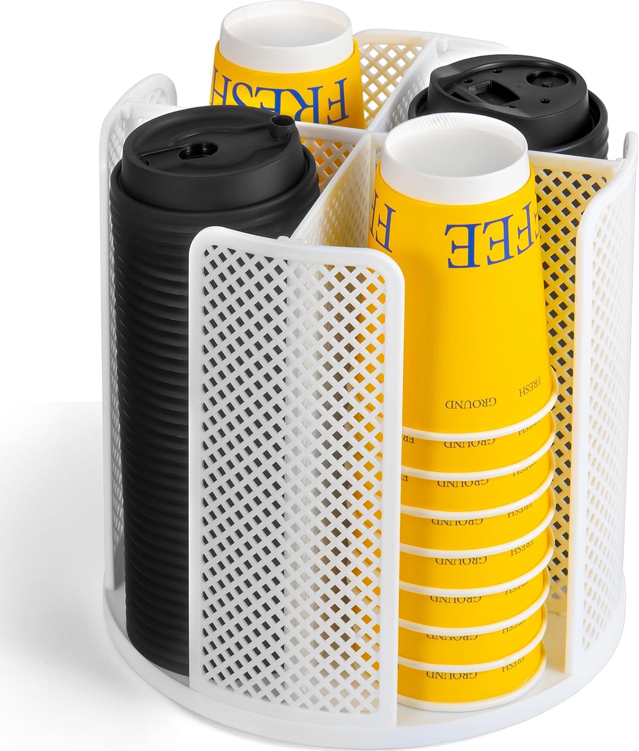 4-Compartment Rotating Paper Cup Holder & Coffee Cup Lid Storage Dispenser, Plastic Cup Dispenser Removable, Space-Saving Countertop Cup Holder for Coffee Bars, Kitchens (White)