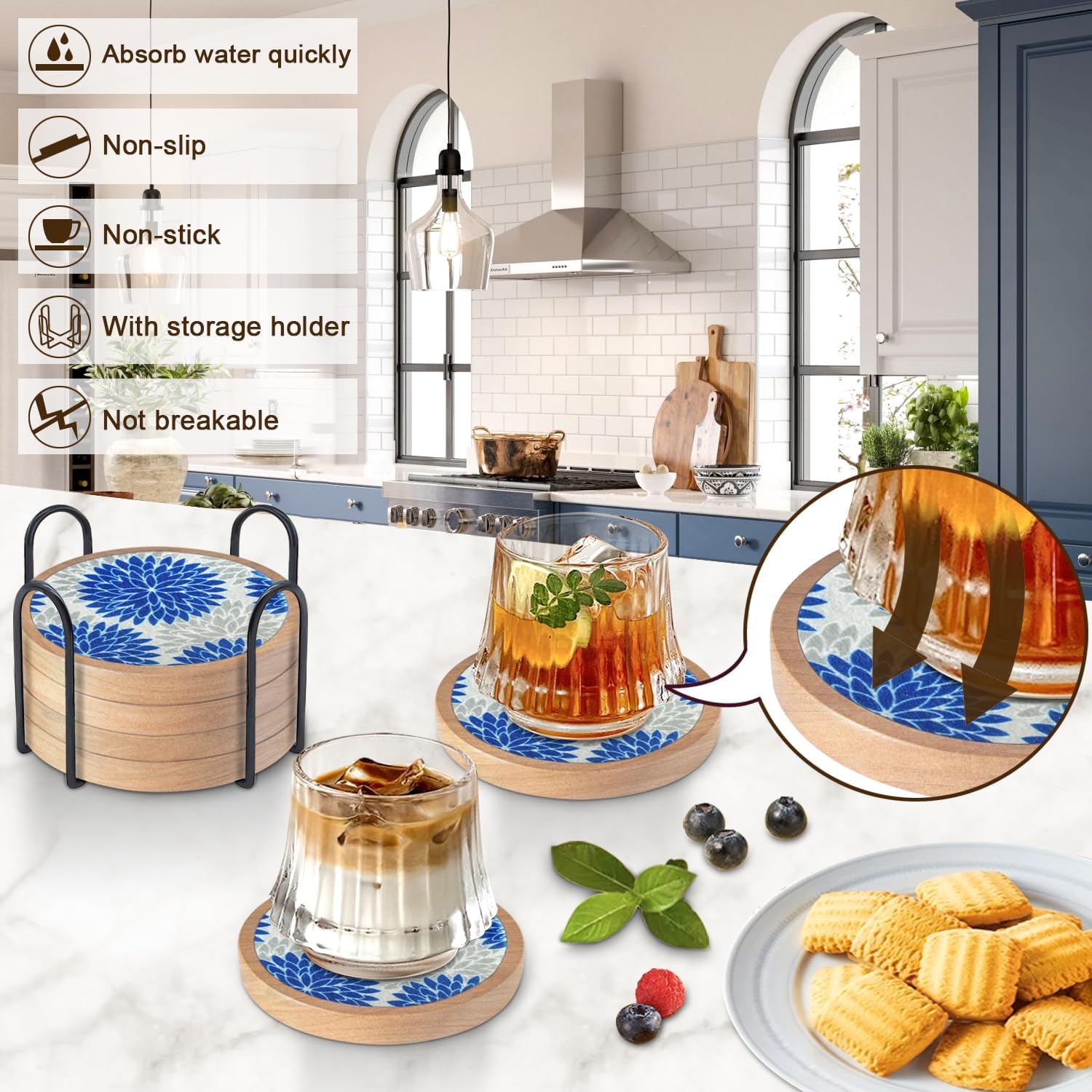 - Non-stick & Coaster with Holder: Cup coaster is thick and flat, good moisture absorption can effectively isolate adhesion forces, prevents coaster from sticking to glasses; durable & aesthetical, non-breakable, suitable for hot and cold drinks, effortlessly protects your furniture, tabletops & counter top, brings your pleasant drinking experience.