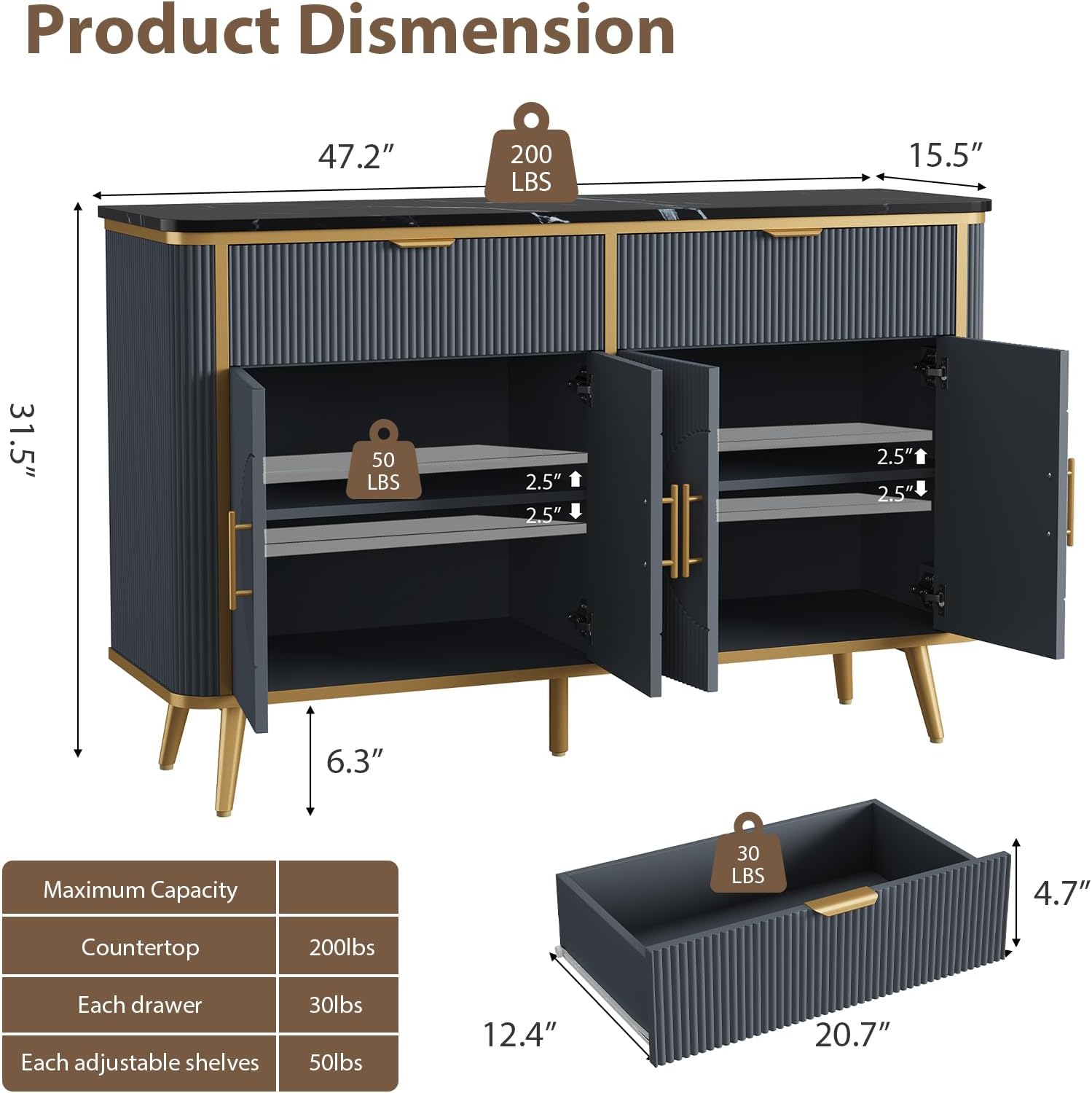 - Durable & Stable construction—Adapting solid high-grade engineered materials, the buffet sideboard cabinet can safely support up to 200 lbs, ensuring your belongings are stored securely. The countertop is scratch-resistant and waterproof, effortlessly withstanding daily wear and stains. Additionally, the reinforced splayed legs provide ample space for the robot vacuum to clean, helping your room stay clean and tidy daily!
