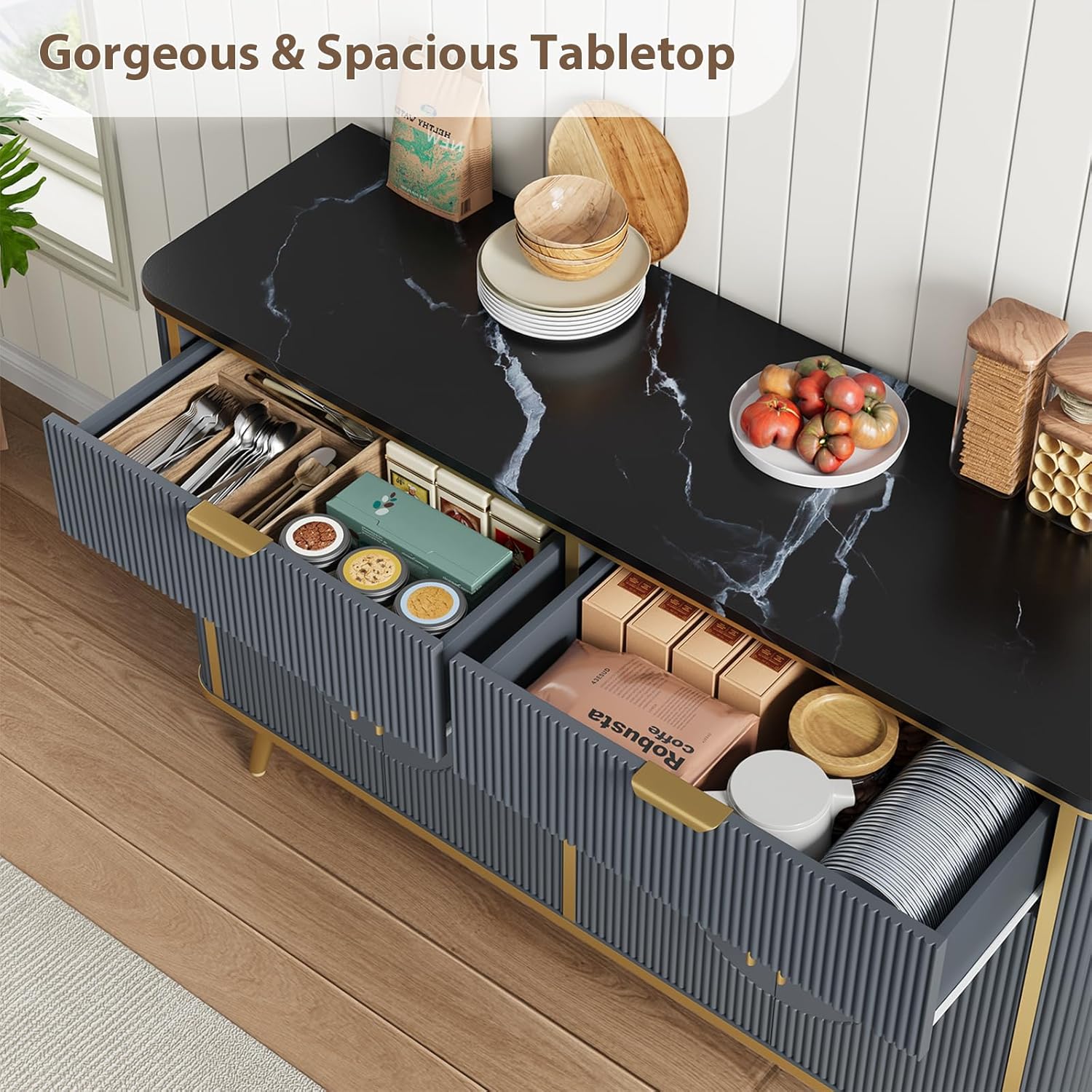 - Modern Fluted Striped Design—This chic sideboard features a unique fluted panel and curved contour design, enhancing a stereo feeling with striking geometric lines. Its exquisite designed polished and frosted handles are matched with the marble-textured finish countertop, which combines modern aesthetics with natural style, adding a touch of fashion and luxury to the room.