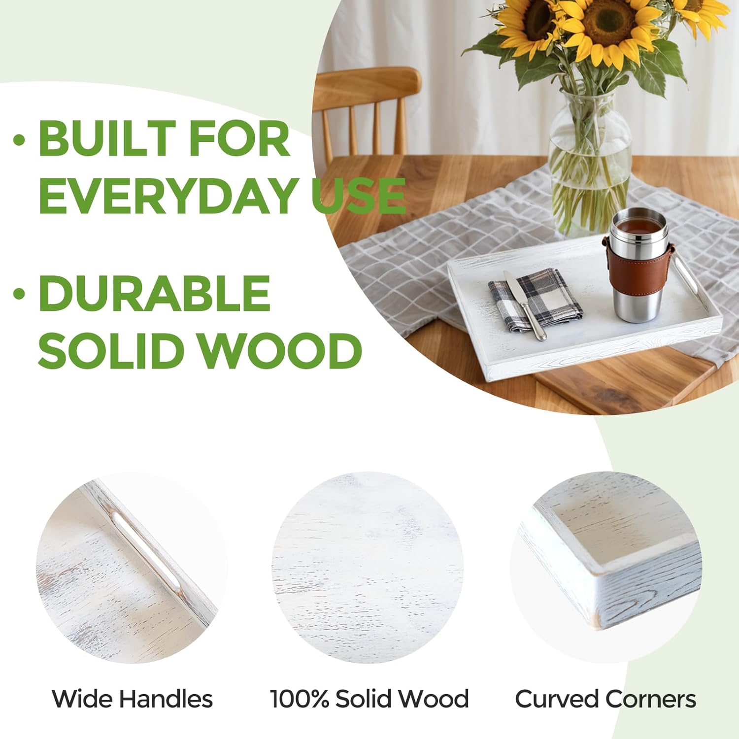S310 Rustic White Wood Serving Tray with Handles, 17 Inch Wooden Tray for Ottoman, Breakfast, Lunch, Dinner, Decorative Rectangular Tray for Living Room, Kitchen Counter, Outdoor