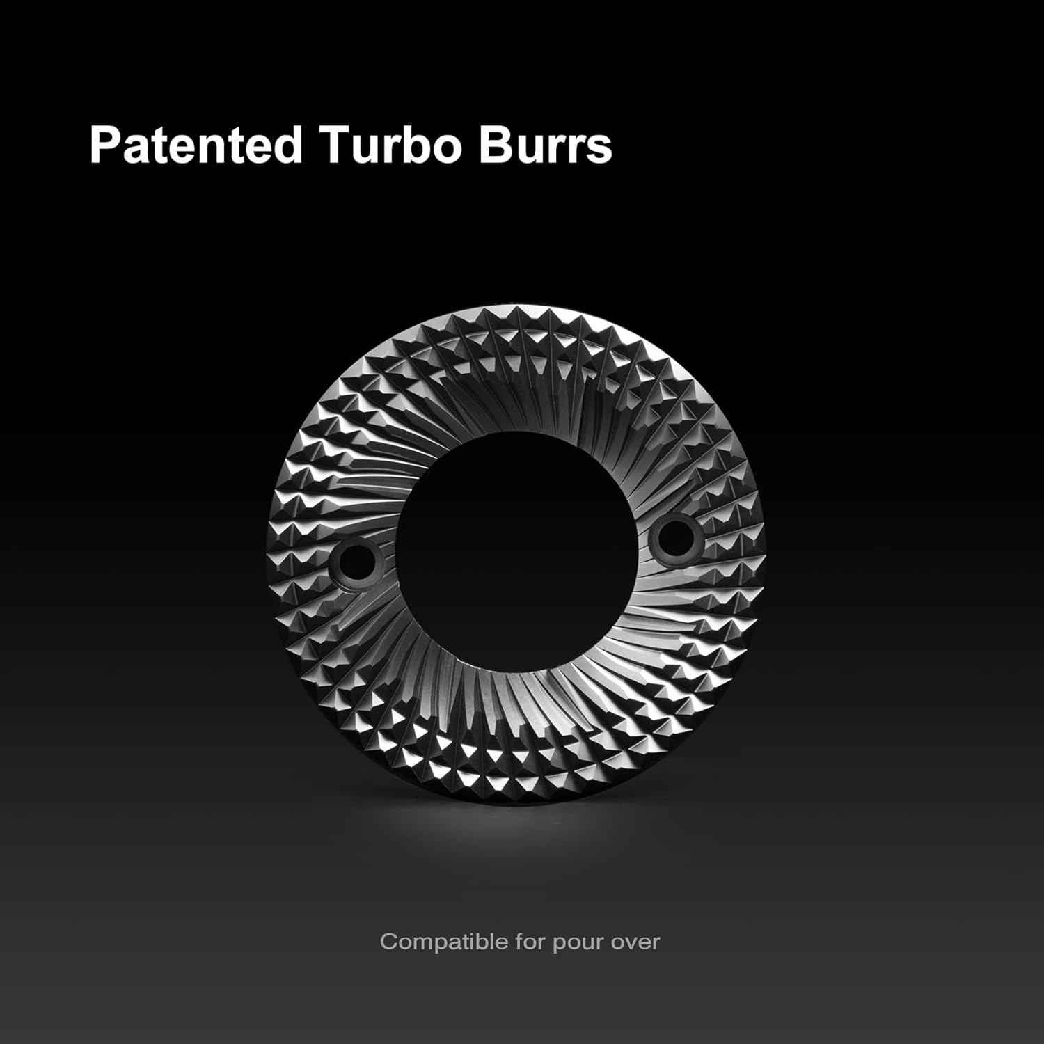 - Patented 078 Turbo Burrs: Featuring three layers of teeth for fast, consistent grinding. These burrs also effectively reduce fines that are typically caused by squeezing the beans during grinding.