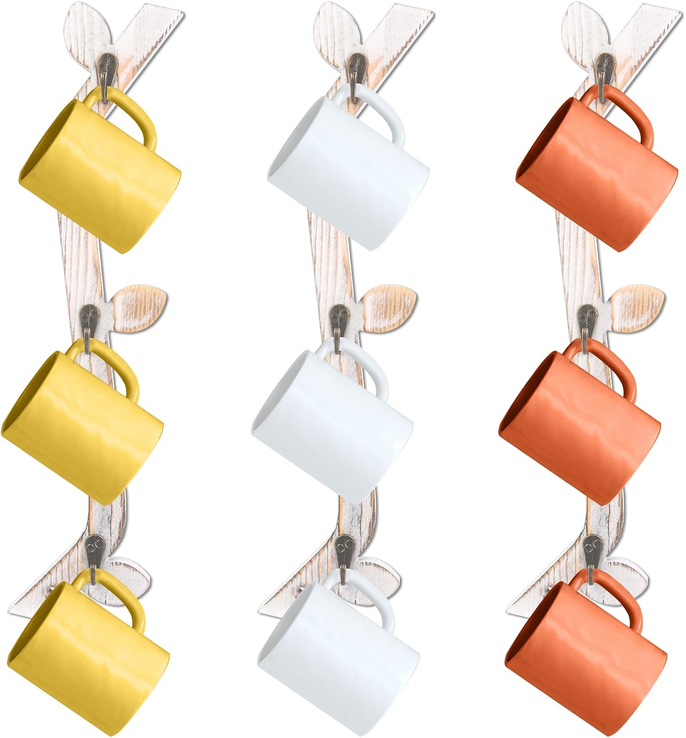 3 Pack Wood Coffee Mug Wall Rack with 9 Hooks Wall Mount Coffee Cup Holder White Espresso Cup Display Stand Tea Cup Hanger Display Wall for Kitchen Cafe Bar