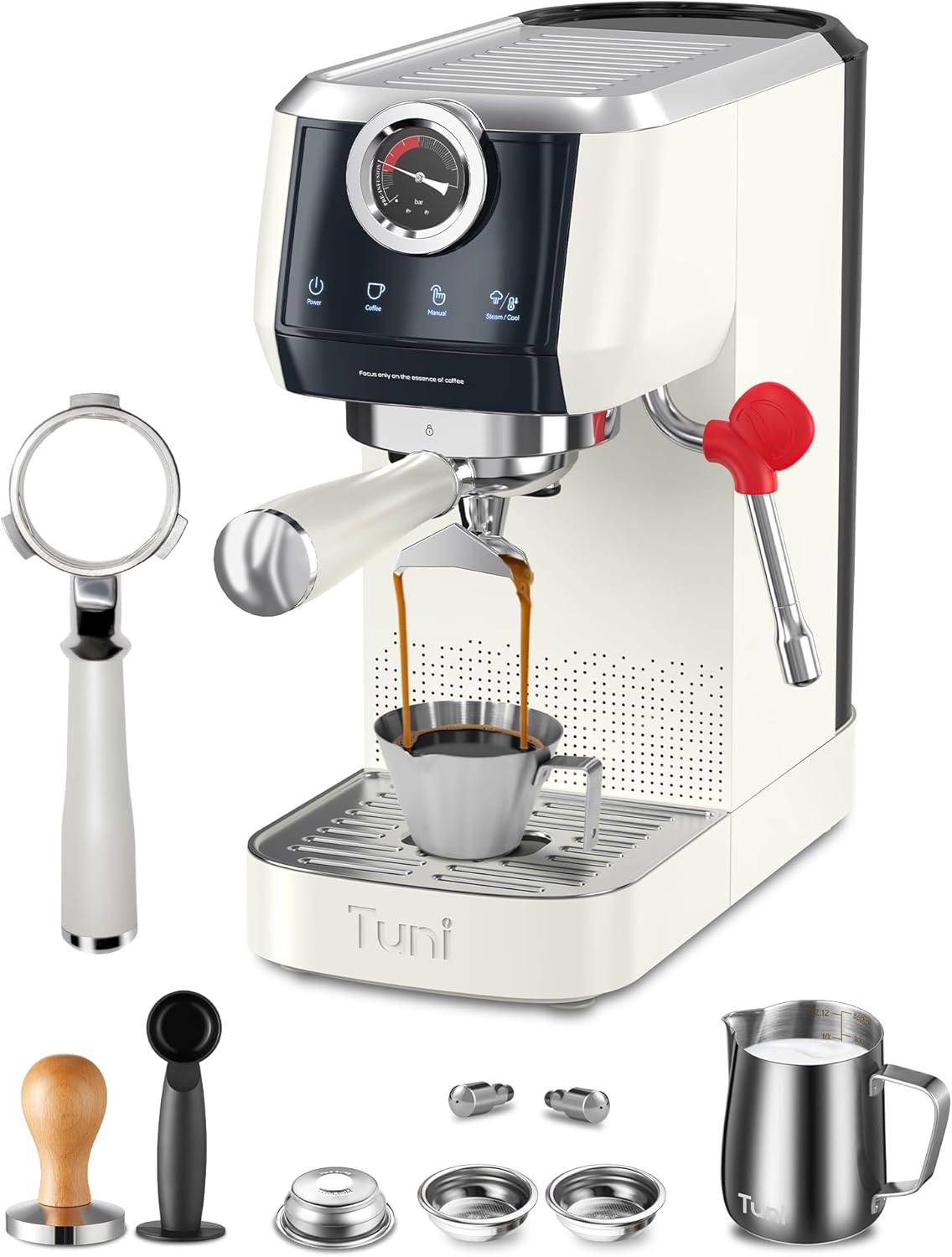 - [๐๐๐ฎ๐น ๐๐ฒ๐ฎ๐๐ถ๐ป๐ด ๐ฆ๐๐๐๐ฒ๐บ & ๐ฎ๐ฌ-๐๐ฎ๐ฟ ๐๐ถ๐ด๐ต ๐ฃ๐ฟ๐ฒ๐๐๐๐ฟ๐ฒ] - The Tuni semi-automatic espresso machine heats up in just 30 seconds and extracts rich crema, letting you enjoy a delicious espresso quickly. It features an original Italian 20-bar ULKA water pump and a built-in visual pressure gauge, with precise temperature control via PID + NTC to ensure full extraction of flavor and oils, resulting in a rich and aromatic espresso.