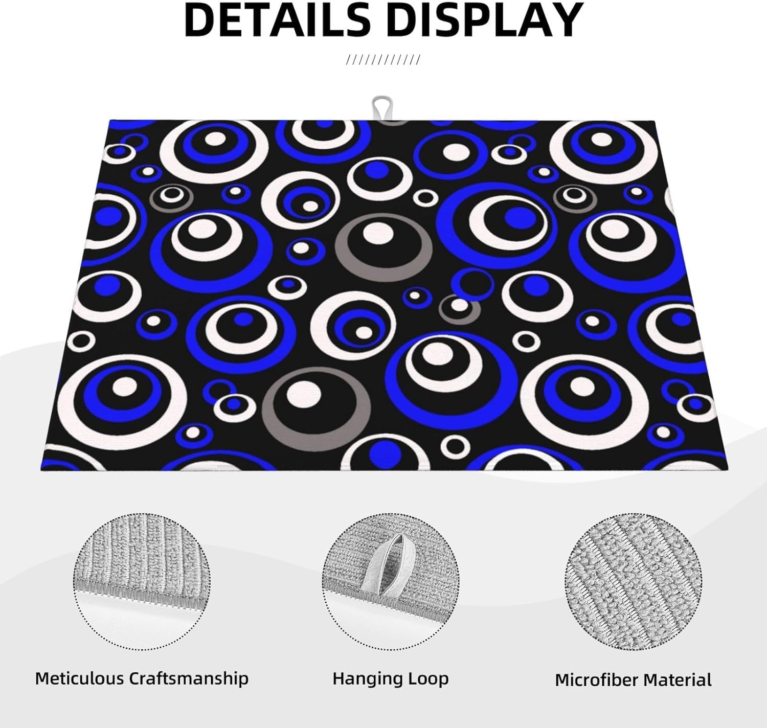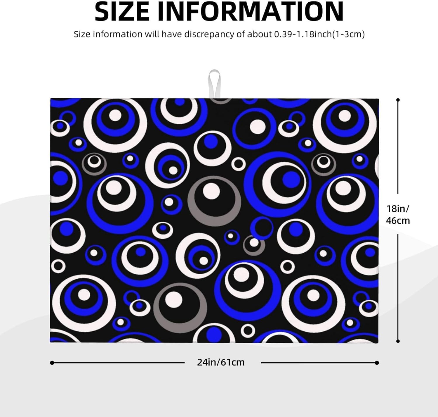 - Unique Design Style: Stand out with this decorative drying mat featuring a modern blue, black, white geometric circle pattern. It’s not just an absorbent drying mat but also a stylish kitchen counter mat that adds a touch of modern art to your kitchen decor, perfect as a countertop drying mat with geometric flair. The reverse side is pure gray, and there's a hanging loop for easy storage, combining functionality with stylish design